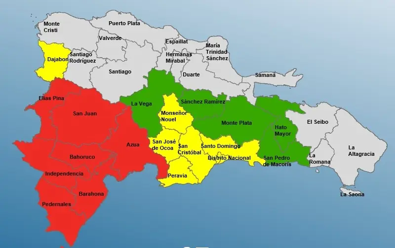 En alerta amarilla están el Santo Domingo, Distrito Nacional, Peravia, Dajabón, Monseñor Nouel, San José de Ocoa y San Cristóbal.