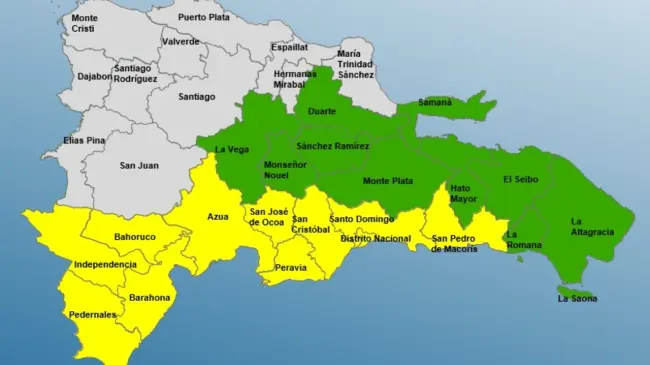 Mientras que en alerta verde hay 10 provincias: La Romana, El Seibo, Sánchez Ramírez, Monte Plata, Duarte, La Altagracia, Hato Mayor, Samaná, La Vega y Monseñor Nouel.
