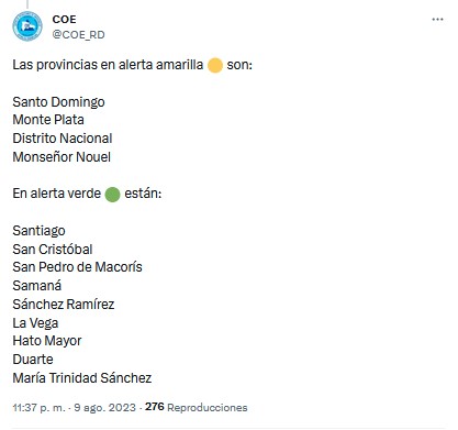 Santo Domingo.– Santo Domingo.- El Centro de Operaciones de Emergencias (COE) aumentó a nueve las provincias en alerta verde y cuatro se mantienen en amarilla por posibles crecidas de ríos, arroyos y cañadas, así como inundaciones repentinas producto a los efectos de una vaguada y onda tropical que seguirán provocando lluvias en lo que resta de la noche y madrugada.