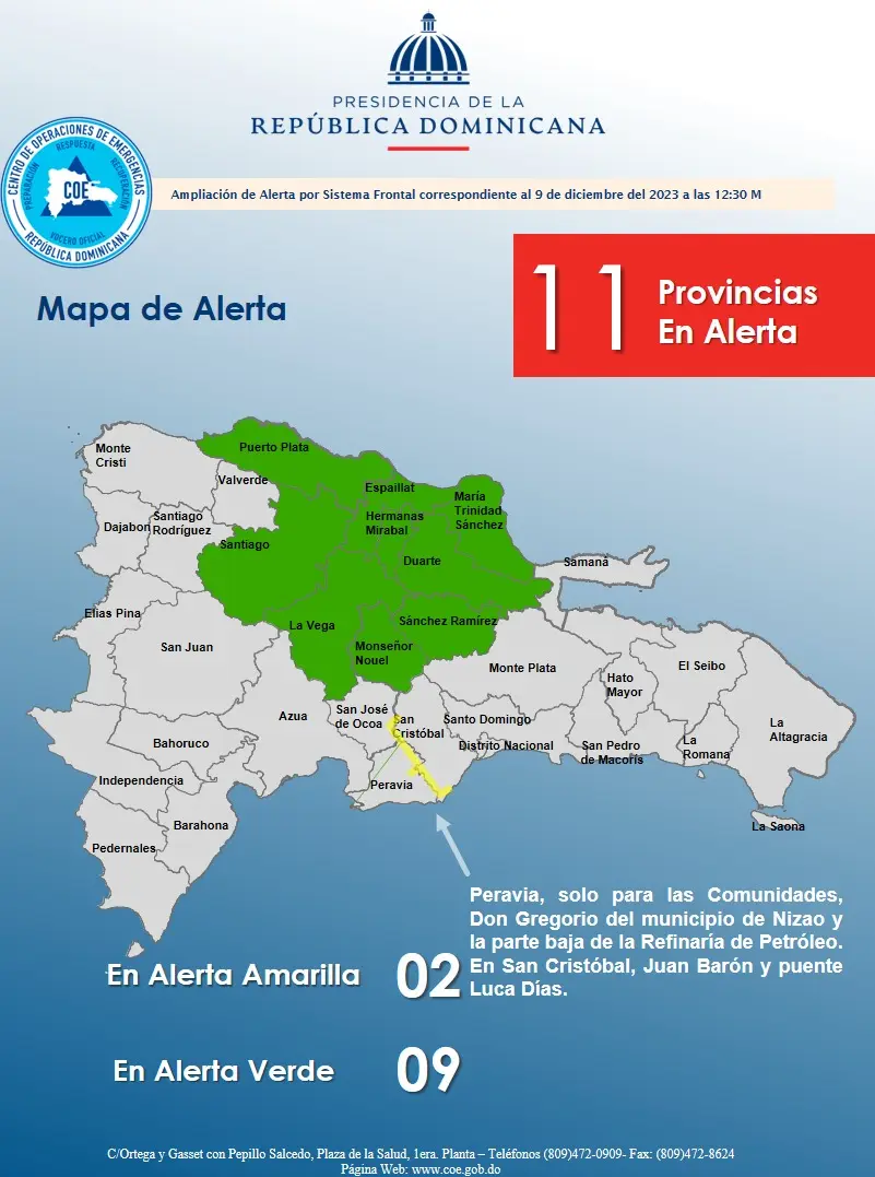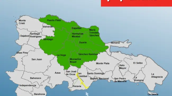 En alerta amarilla están: En Peravia solo para las comunidades Don Gregorio del municipio Nizao y la parte baja de la Refinería de petróleo. Mientras que en San Cristóbal: Juan Barón, el puente Lucas Días. En alerta verde están: Espaillat, Hermanas Mirabal, María Trinidad Sánchez, La Vega, Monseñor Nouel, Sánchez Ramírez, Santiago, Puerto Plata y Duarte.