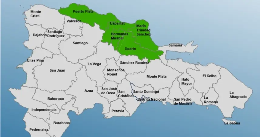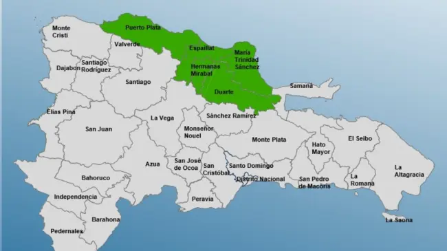 Las provincias en alerta verde son: Duarte, Puerto Plata, Hermanas Mirabal, María Trinidad Sánchez y Espaillat.