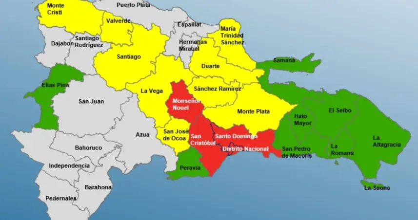 En alerta amarilla fueron colocadas las provincias Monte Plata, Sánchez Ramírez y Duarte, con atención especial en la zona del Bajo Yuna, así como María Trinidad Sánchez, San José de Ocoa, Santiago, Montecristi, Valverde y La Vega. Mientras tanto, están en alerta verde San Pedro de Macorís, El Seibo, Elías Piña, Peravia, Hato Mayor, La Romana, Samaná y La Altagracia.
