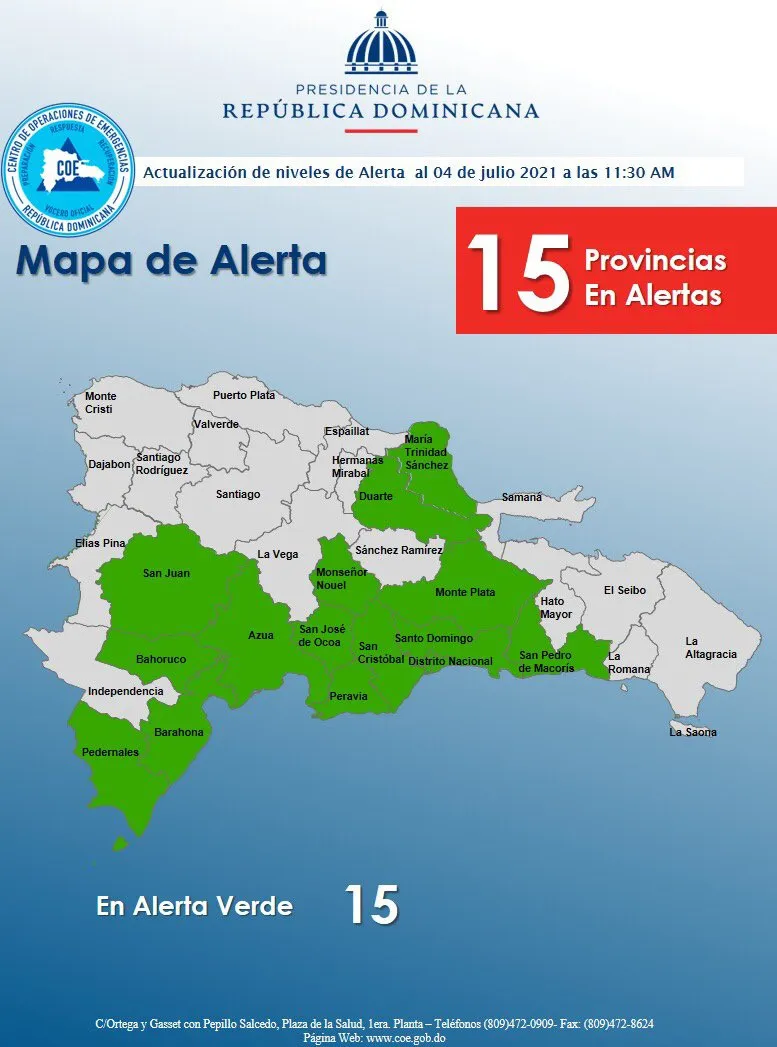 A pesar de que disminuirán las lluvias según la ONAMET, por posibles inundaciones urbanas y rurales, crecidas de ríos y cañadas y deslizamientos de tierra tras los estragos de la tormenta Elsa, el Centro de Operaciones de Emergencia mantiene en alerta verde a: