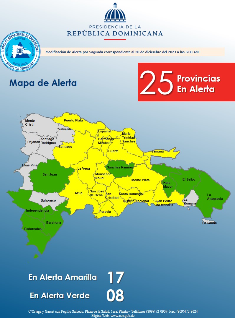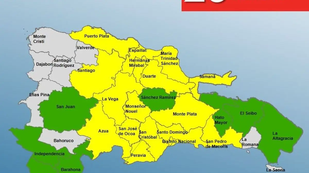 En alerta amarilla están: María Trinidad Sánchez, Puerto Plata, San José de Ocoa, Hermanas Mirabal, Monseñor Nouel, San Pedro de Macorís, Santiago, Santo Domingo, San Cristóbal, La Vega, Monte Plata, Azua, Duarte, Espaillat, Samaná, Distrito Nacional y Peravia.
