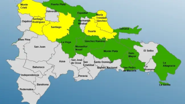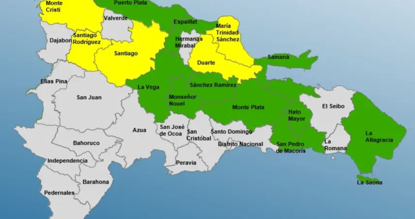 Las provincias en alerta amarilla son: María Trinidad Sánchez, Santiago Duarte, (en especial el Bajo Yuna), Montecristi y Santiago Rodríguez.