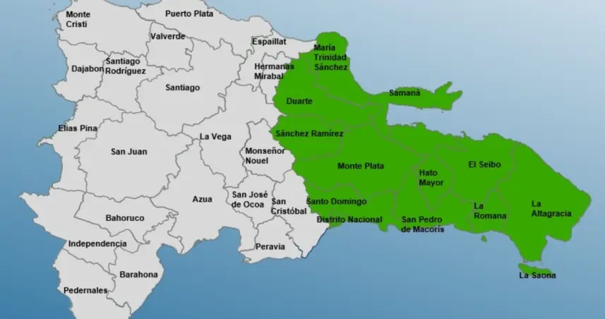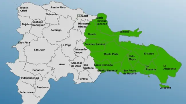 Las provincias que se encuentran en alerta son la Provincia de Santo Domingo, Distrito Nacional, María Trinidad Sánchez, San Pedro de Macorís, El Seibo, Hato Mayor, La Altagracia, La Romana, Duarte, Sánchez Ramírez, Samaná y Monte Plata.