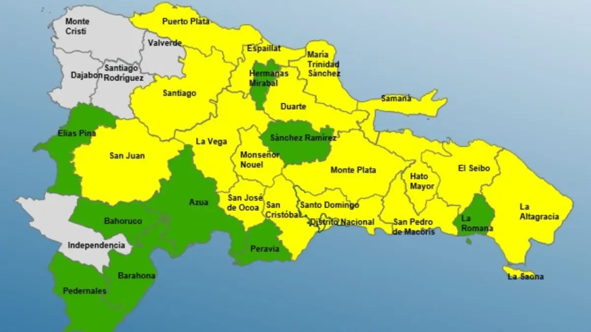 Las provincias que están en alerta amarilla son; Puerto Plata, María Trinidad Sánchez, La Altagracia, Prov. Santo Domingo, Hato Mayor, Monseñor Nouel, Espaillat, San Pedro de Macorís, San Cristóbal, Samaná, Duarte, Distrito Nacional, El Seibo, La Vega, Monte Plata, Santiago, San José de Ocoa y San Juan.