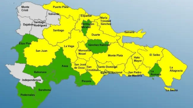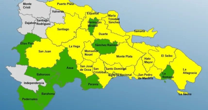 Mientras que las provincias que están en alerta verde son; Sánchez Ramírez, La Romana, Elías Piña, Barahona, Peravia, Bahoruco, Azua, Hermanas Miraba y Pedernales.