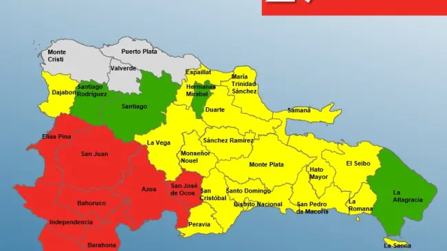 Mientras que en alerta amarilla se encuentran Santo Domingo, Distrito Nacional, Peravia, Dajabón, La Vega, María Trinidad Sánchez, Hato Mayor, Duarte, San Pedro de Macorís, Monseñor Nouel, Espaillat, San Cristóbal, Sánchez Ramírez, Monte Plata, Samaná y El Seibo y La Romana.