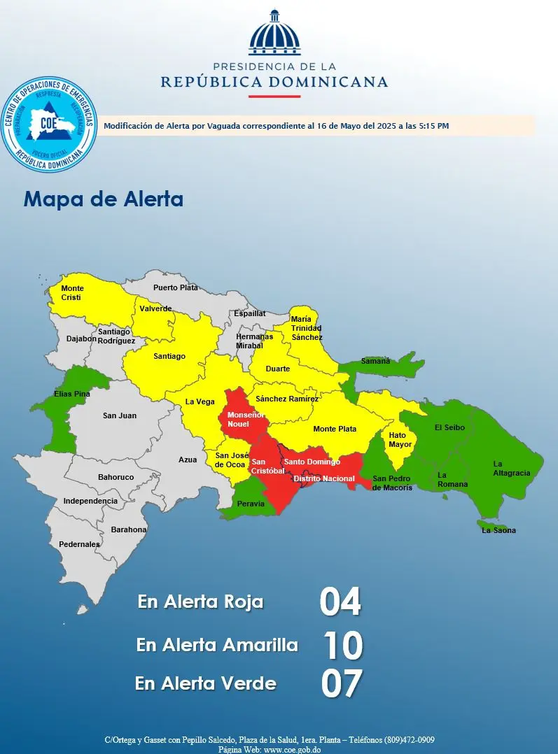 Santo Domingo.– Santo Domingo. – El Centro de Operaciones de Emergencias (COE) elevó este viernes los niveles de alerta en varias provincias del país debido a las intensas lluvias provocadas por una vaguada que incide en varios niveles de la troposfera.