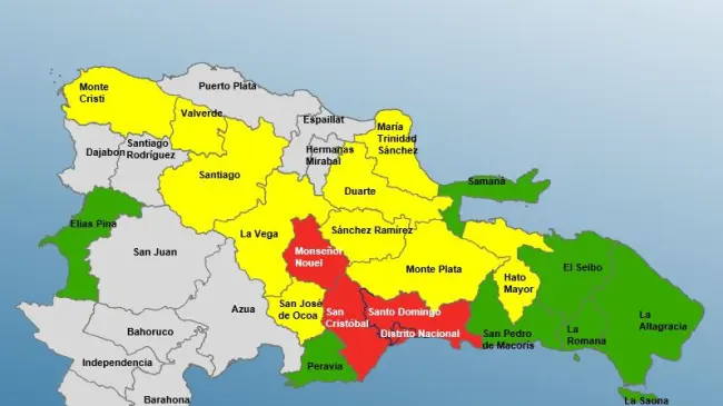 Alerta Amarilla: Monte Plata, La Romana, Sánchez Ramírez, Duarte (especialmente el Bajo Yuna), María Trinidad Sánchez, La Vega, Santiago, Montecristi, Valverde, Elías Piña.
