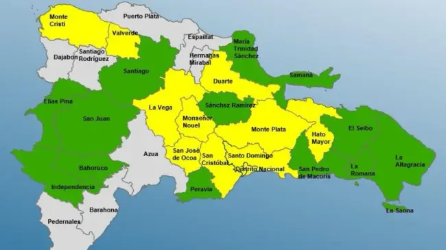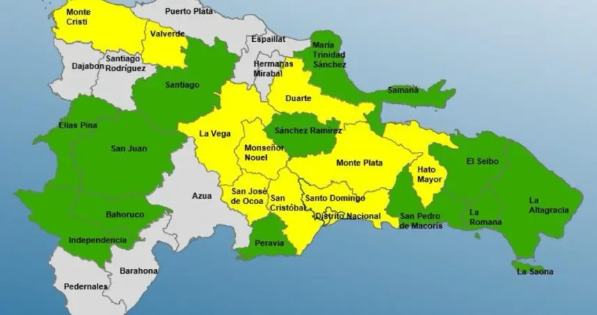 Alerta verde: María Trinidad Sánchez, Santiago, Sánchez Ramírez, Bahoruco, Independencia, San Pedro de Macorís, El Seibo, Elías Piña, Peravia, La Romana, Samaná, La Altagracia y San Juan.