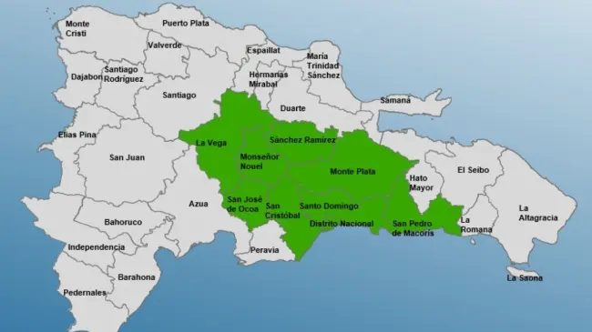 Las provincias en alerta son: Santo Domingo y el Distrito Nacional, San Cristóbal, Monseñor Nouel, Monte Plata, San José Ocoa, La Vega, Sánchez Ramírez y San Pedro de Macorís.