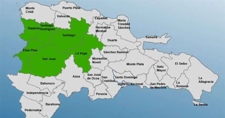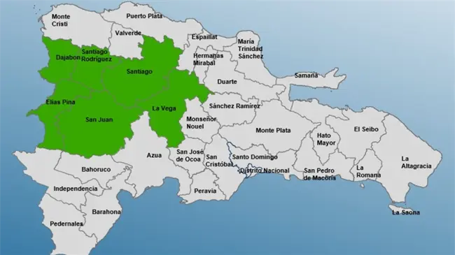 Las lluvias serán más frecuentes en localidades de las provincias: El Seibo, Hato Mayor, Monte Plata, Sánchez Ramírez, Duarte, Samaná, Espaillat, La Vega, Monseñor Nouel, Azua, San Juan, Santiago, Valverde, Santiago Rodríguez, Dajabón, Elías Piña, Independencia y Bahoruco.