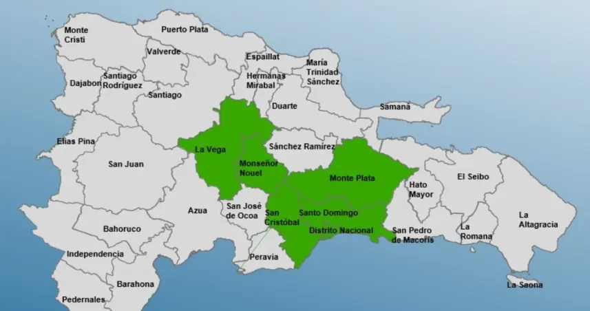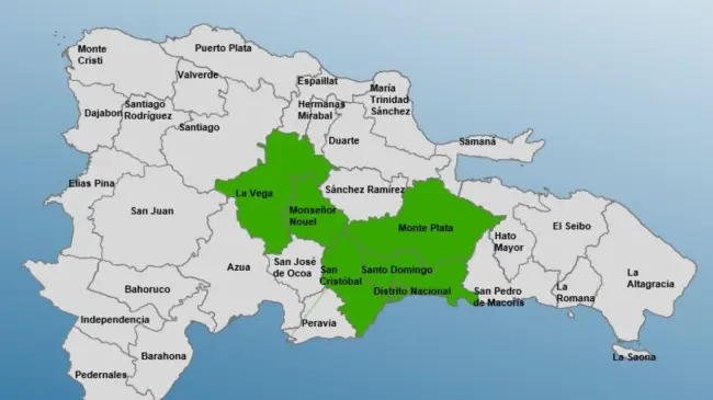 Las provincias en alerta verde son: Monte Plata, San Cristóbal, La Vega, Monseñor Nouel, Santo Domingo y el Distrito Nacional.