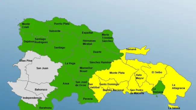 Por el momento en alerta amarilla se encuentran: Hato Mayor, San Pedro de Macorís, Santo Domingo, La Altagracia, Distrito Nacional, Samaná, San Cristóbal, y Puerto Plata.