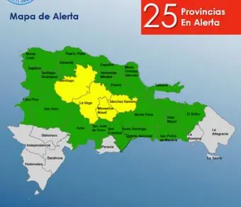 Asimismo, el organismo indicó que el alerta amarilla corresponde a Santiago, La Vega, Sánchez Ramírez y Monseñor Nouel.