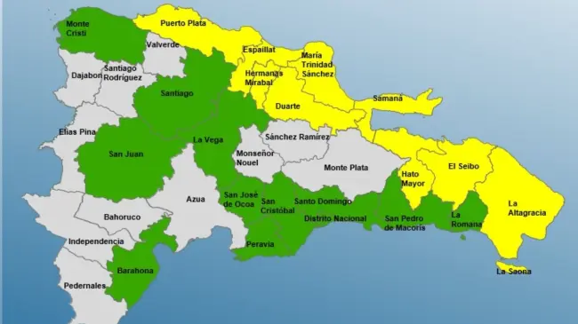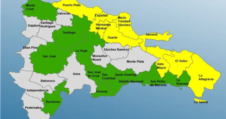 Mientras que en alerta amarilla están: Puerto Plata, María Trinidad Sánchez, Espaillat, Hato Mayor, El Seibo, Samaná, Duarte, Hermanas Mirabal y La Altagracia.