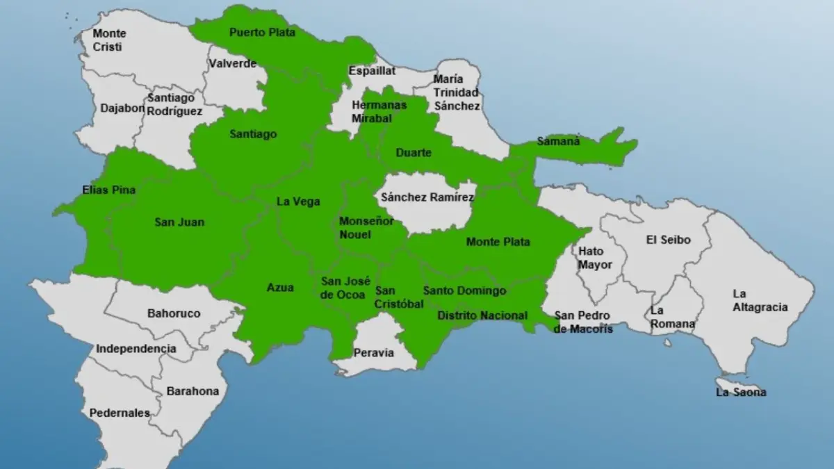 La modificación de los niveles de alerta, mantiene sobre aviso a las provincias: San Juan Samaná, Hermanas Mirabal, San Cristóbal, Monseñor Nouel, Puerto Plata, Santiago, Elías Piña, San José de Ocoa, Distrito Nacional, Santo Domingo, Duarte, La Vega, Espaillat y Azua.