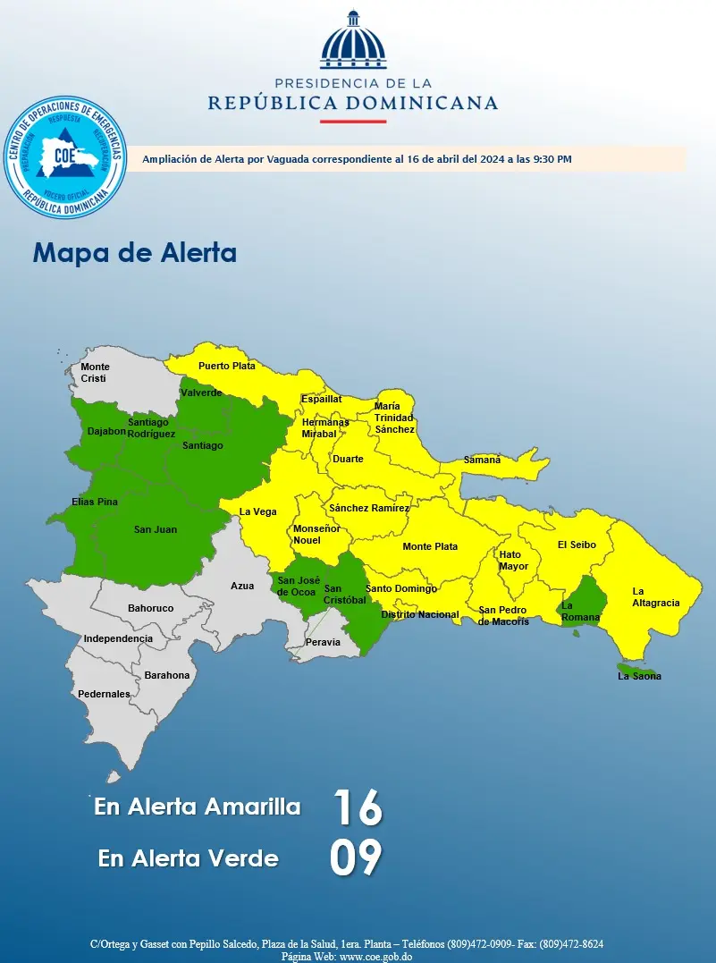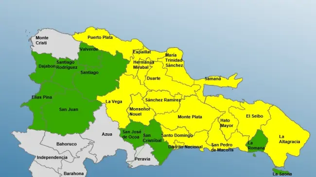 Las provincias bajo alerta amarilla son Santo Domingo, Distrito Nacional, Sánchez Ramírez, María Trinidad Sánchez, La Vega, Hermanas Mirabal, Monseñor Nouel, San Pedro de Macorís, Monte Plata, Hato Mayor Samaná, Duarte, Espaillat, El Seibo, Puerto Plata y La Altagracia.