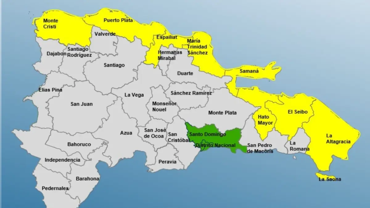 De acuerdo con el boletín oficial, las provincias en alerta amarilla son La Altagracia, Hato Mayor, Espaillat, Monte Cristi, El Seibo, Samaná, María Trinidad Sánchez y Puerto Plata.
