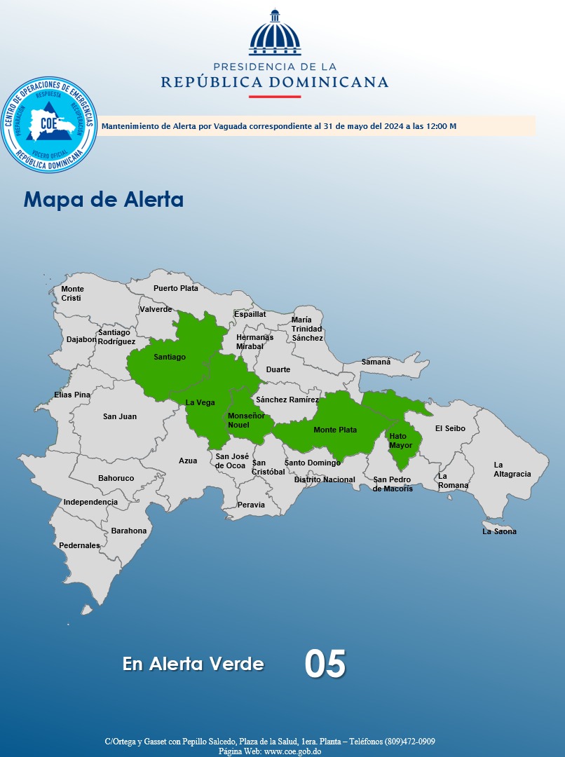 Las provincias en alerta verde son: Monte Plata, Hato Mayor, La Vega, Monseñor Nouel y Santiago.