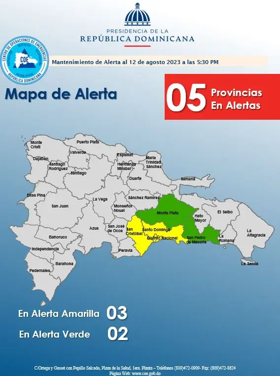 Las provincias en alerta verde son: Monte Plata y San Pedro de Macorís, mientras que en alerta amarilla se encuentra San Cristóbal, Santo Domingo y el Distrito Nacional.