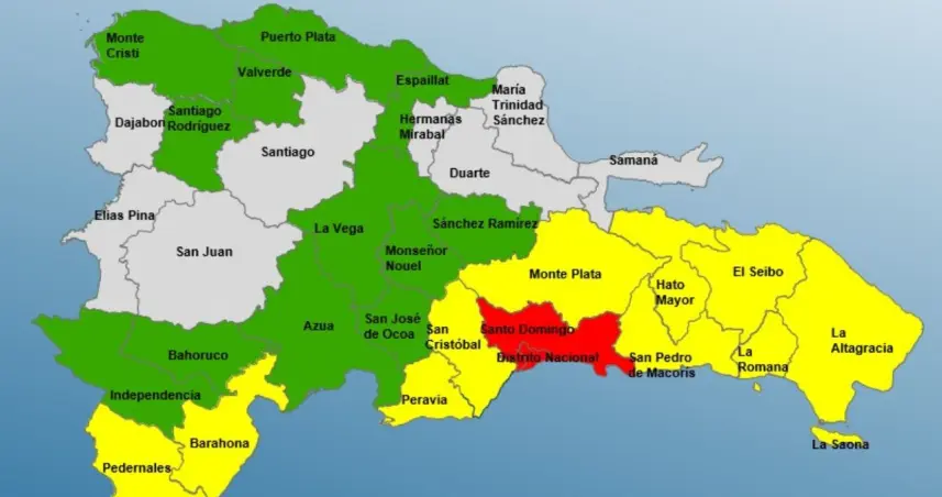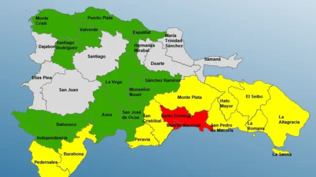 En alerta amarilla permanecen: Peravia, La Altagracia, San Cristóbal, San Pedro de Macoris, Pedernales, La Romana, Barahona, Monte Plata, Hato Mayor, El Seibo. Mientras en verde están: Independencia, Azua, Puerto Plata, La Vega, Bahoruco, Espaillat, Monseñor Nouel, Sánchez Ramírez, San José de Ocoa, Valverde, Montecristi, Santiago Rodríguez.