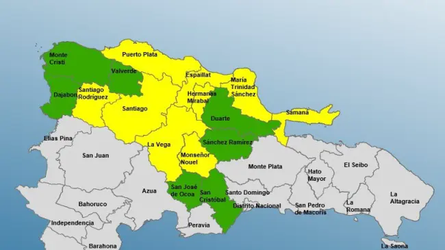 Provincias en alerta amarilla incluyen La Vega y Puerto Plata; en verde, San José de Ocoa y Dajabón.