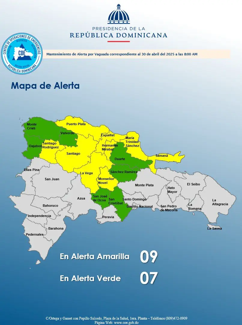 En alerta amarilla se encuentran: La Vega, Monseñor Nouel, Santiago, Santiago Rodríguez, Samaná, Puerto Plata, Hermanas Mirabal, María Trinidad Sánchez y Espaillat.