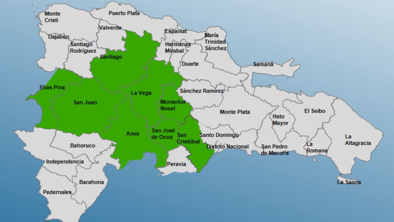 Las provincias en alerta son: Santiago, Monseñor Nouel, Elías Piña, San José de Ocoa, San Juan, La Vega, San Cristóbal y Azua.