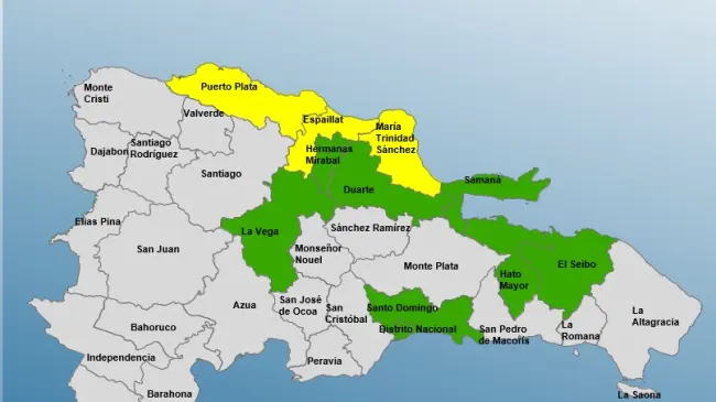 En este sentido el COE indicó los niveles de alerta amarilla para: Puerto Plata, María Trinidad Sánchez y Espaillat y en verde, El Seibo, Hato Mayor, Santo Domingo, Distrito Nacional, Samaná, Hermanas Mirabal, Duarte y La Vega. En tanto que se descontinúan las alertas para Montecristi y Santiago.