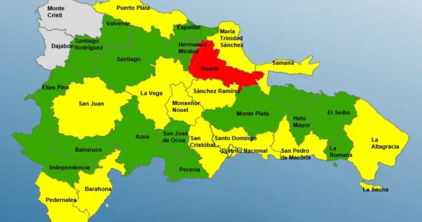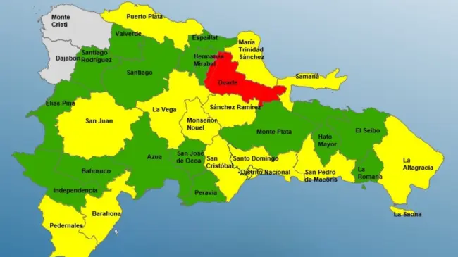 Mientras que en amarilla están: Puerto Plata, Samaná, San Cristóbal, Barahona, María Trinidad Sánchez, San Juan, La Altagracia, Distrito Nacional, Prov. Santo Domingo, San Pedro de Macorís, La Vega, Sánchez Ramírez, Monseñor Nouel, Pedernales. Y en alerta Roja se encuentra la provincia Duarte (En Especial el bajo Yuna).