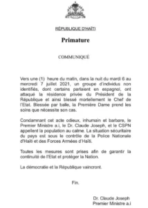 El primer ministro de Haití, Claude Joseph, emitió un comunicado en el que confirma que a eso de las 1:00 de la madrugada Moïse fue mortalmente herido.