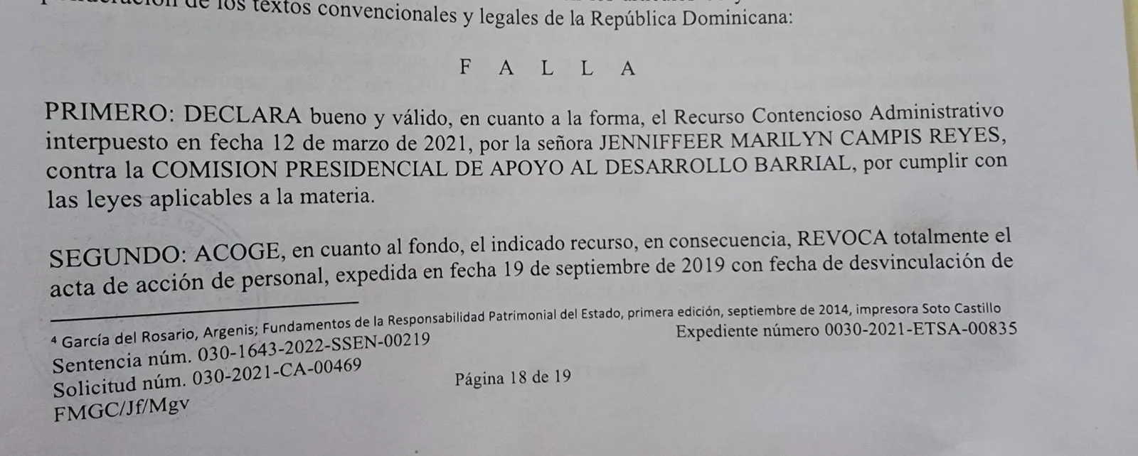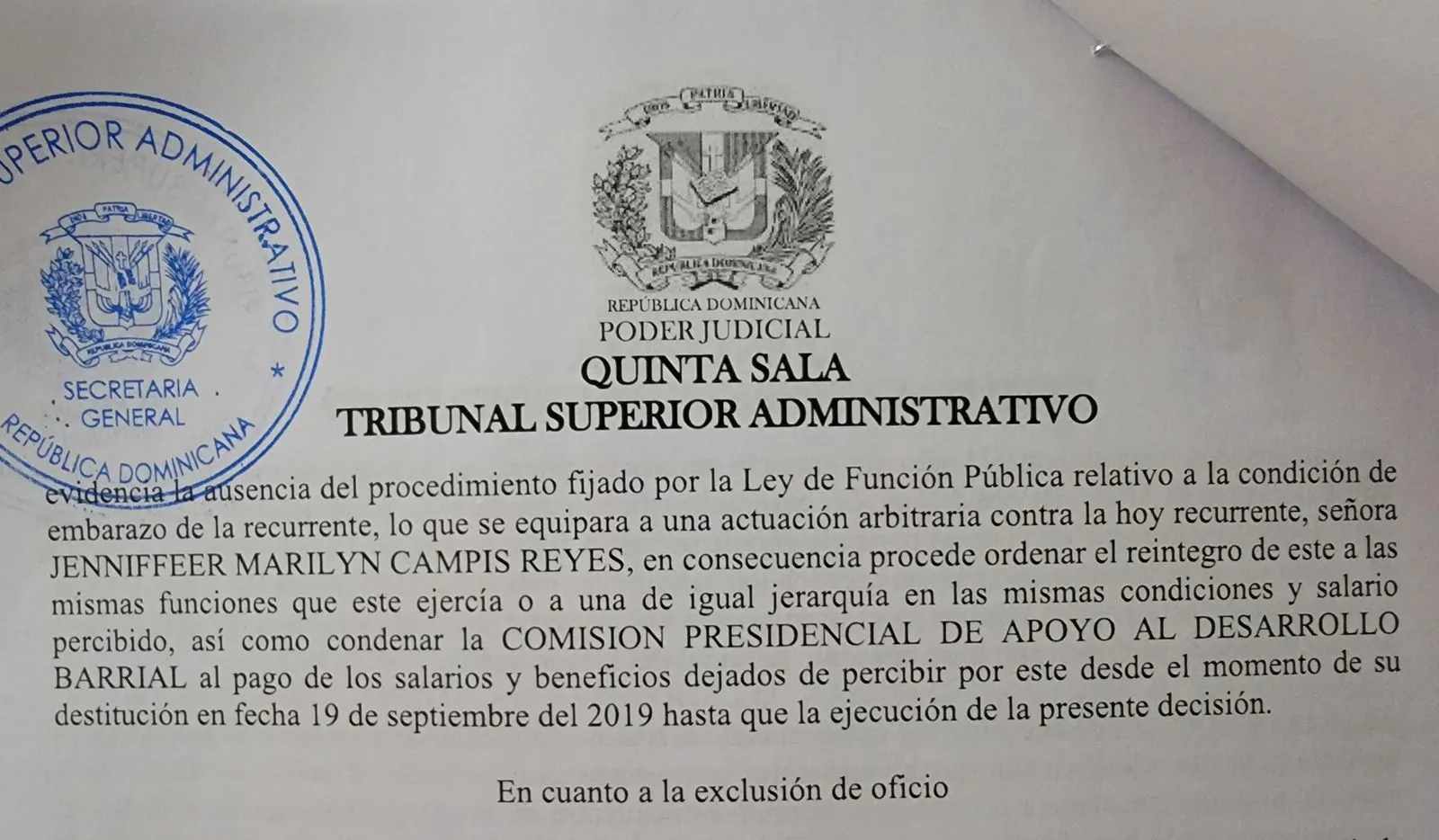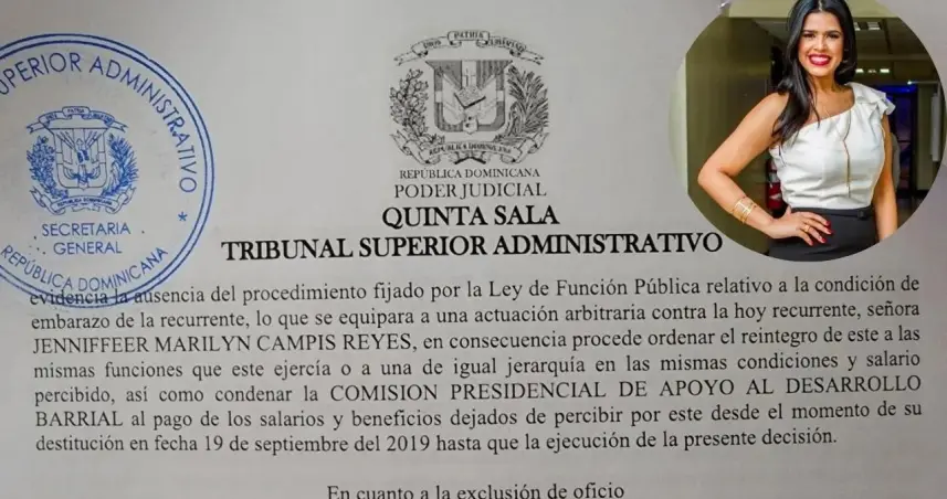 SANTO DOMINGO.- La Comisión Presidencial de Apoyo al Desarrollo Barrial (Cpadbrd) se niega a acatar la sentencia de Tribunal Superior Administrativo no. 030-1643-2022-SSEN-0019, mediante la que un juez ordenó la reintegración, pago de salarios pendientes y una indemnización por daños y prejuicios por toda la ilegalidad cometida, a favor de Jenniffer Campis, quien fue cancelada de la institución en estado de embarazo y siendo miembro de la Comisión de Ética Pública.