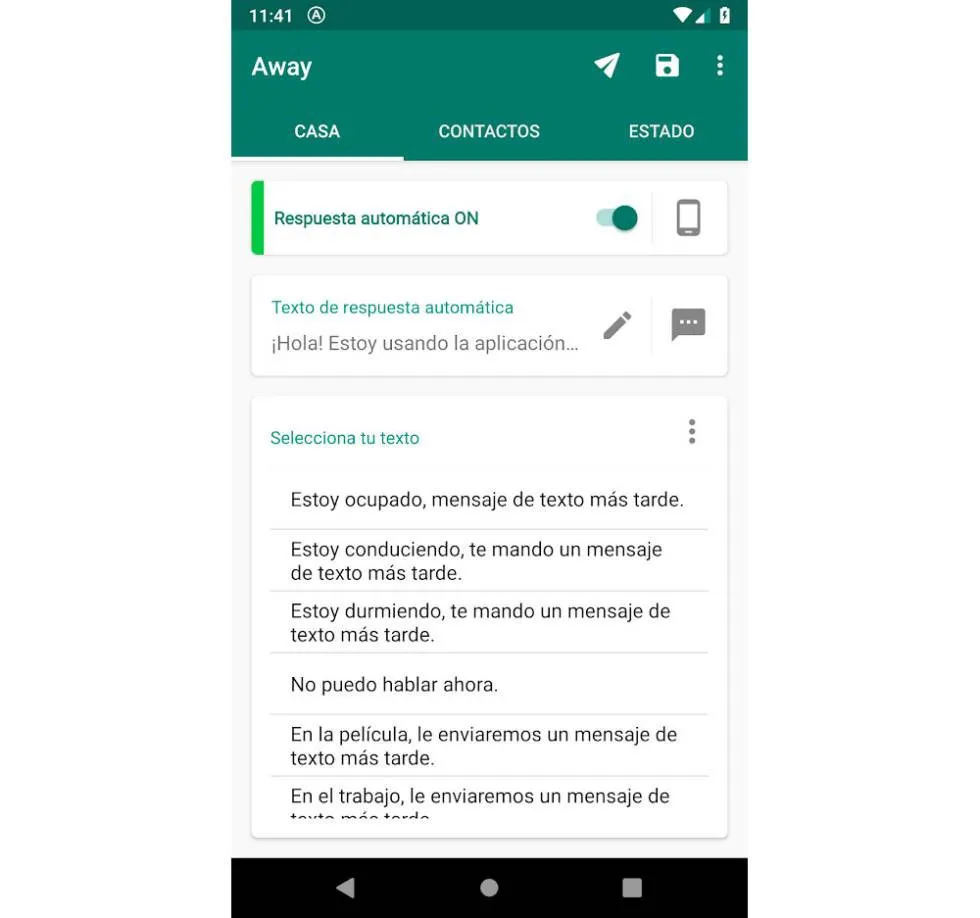 2. En la primera pantalla le aparecerá el menú principal, en el que podrá establecer el Texto de respuesta automática que quiere que aparezca en la versión original de WhatsApp. Puede escribirlo usted mismo o puede seleccionar alguna de las opciones predeterminadas que arroja la app.