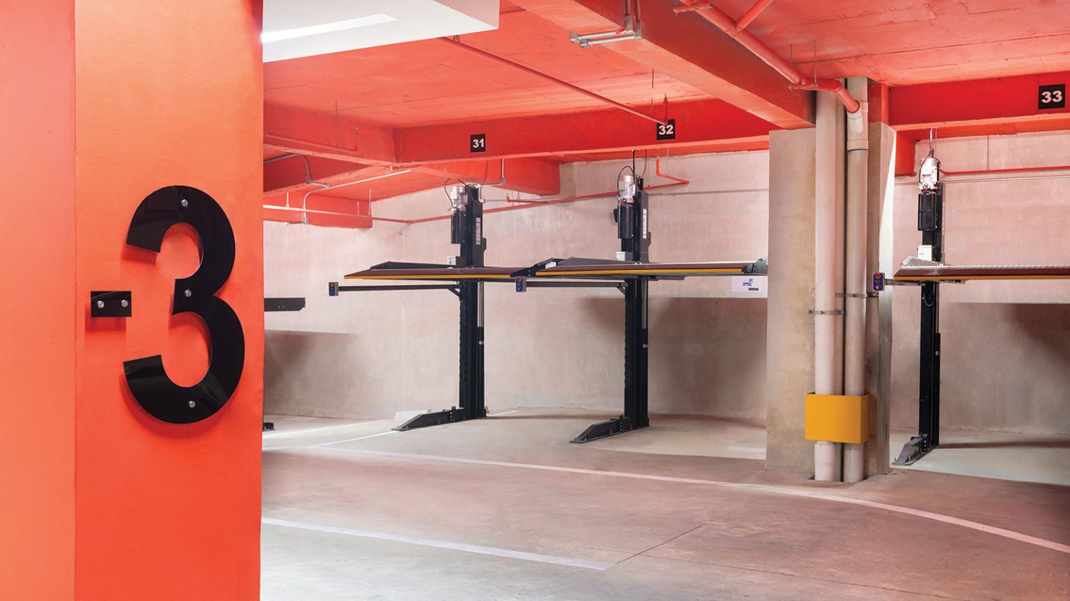 El edificio cuenta con cinco niveles de estacionamiento subterráneo con 95 plazas de estacionamiento. Para aprovechar el espacio, se instalaron multiplicadores mecánicos que aumentan la capacidad de cada plaza, proporcionando una solución a las limitaciones de espacio.