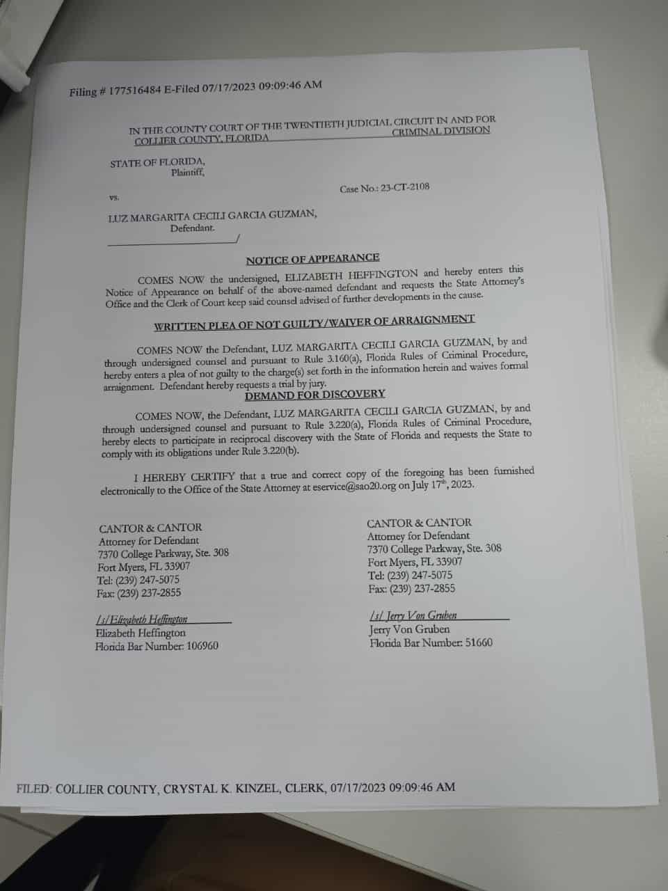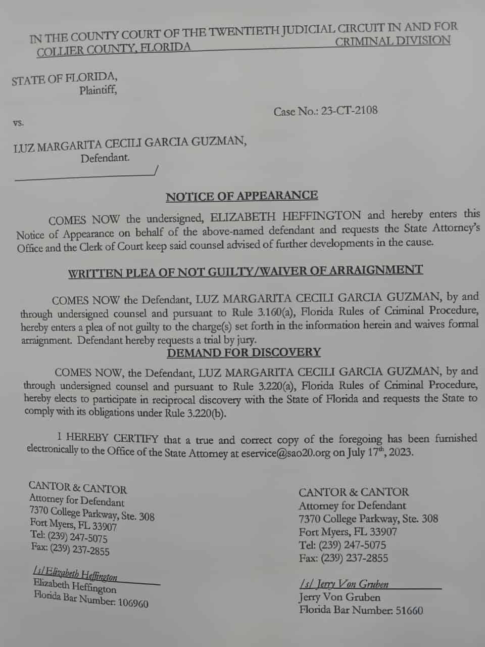 "La acusada Luz Margarita Cecilia García Guzmán, a través de su abogado abajo firmante y de conformidad con la Regla 3.160 (3) del Código de Procedimiento Penal de Florida, se declara no culpable de los cargos establecidos en la información adjunta y renuncia a la lectura formal de la acusación. La acusada solicita un juicio por jurado", se lee en la solicitud enviada a la corte.