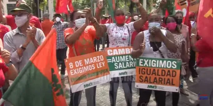 Vociferando consignas miembros del Movimiento de Mujeres Trabajadoras, junto a otros gremios, realizaron este día una manifestación en el parque Enriquillo en demanda de mejores condiciones laborales y salariales, entre otras reclamos.