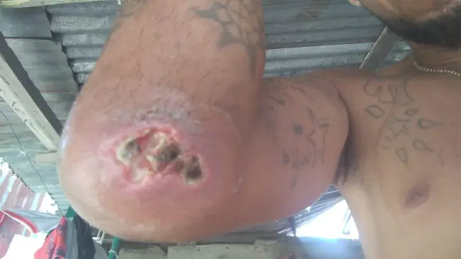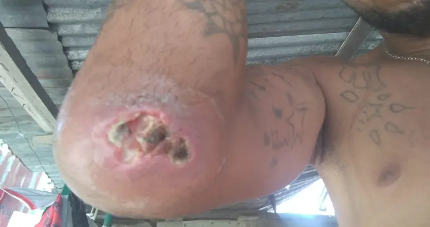El joven dice que desde que comenzó el tratamiento no ve mejoría en su codo y cada vez más el tejido de su piel se necropcia.
