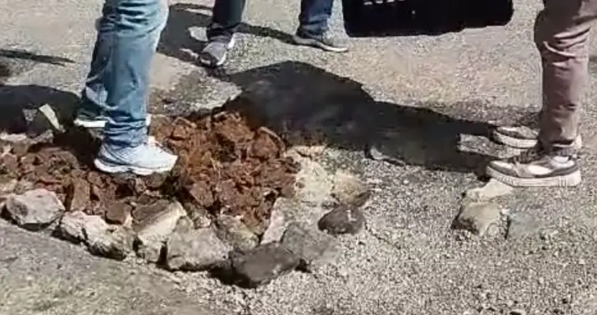 En un video, se puede observar a tres personas cargando piedras en uno de los canastos de vegetales y depositándolas en el punto crítico de la carretera.