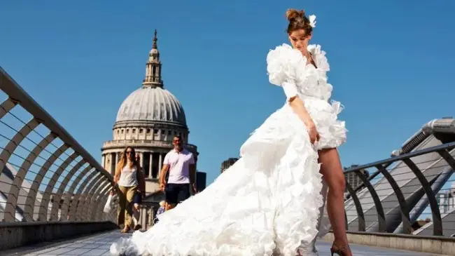 La modelo Jemima Hambro fue la encargada de lucir el particular vestido por las calles de Londres, concretamente por el Puente del Milenio y los exteriores de la catedral de San Pablo, donde algunas personas le hicieron fotos.