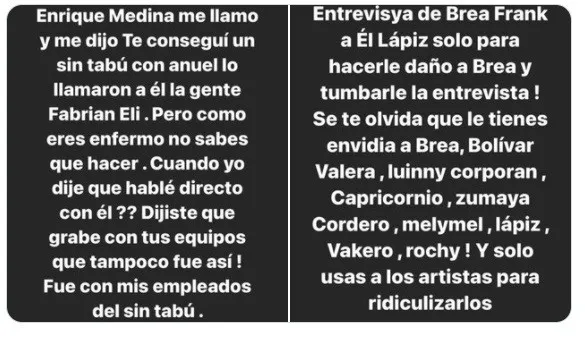 La también modelo este jueves posteo varios estados en su cuenta de Instagram en respuesta a los pronunciamientos de Santiago Matías sobre ella, en las publicaciones mencionó varios artistas y presentadores entre ellos la rapera Melymel, la cual también se unió al debate en redes sociales sobre el despido de la comunicadora.