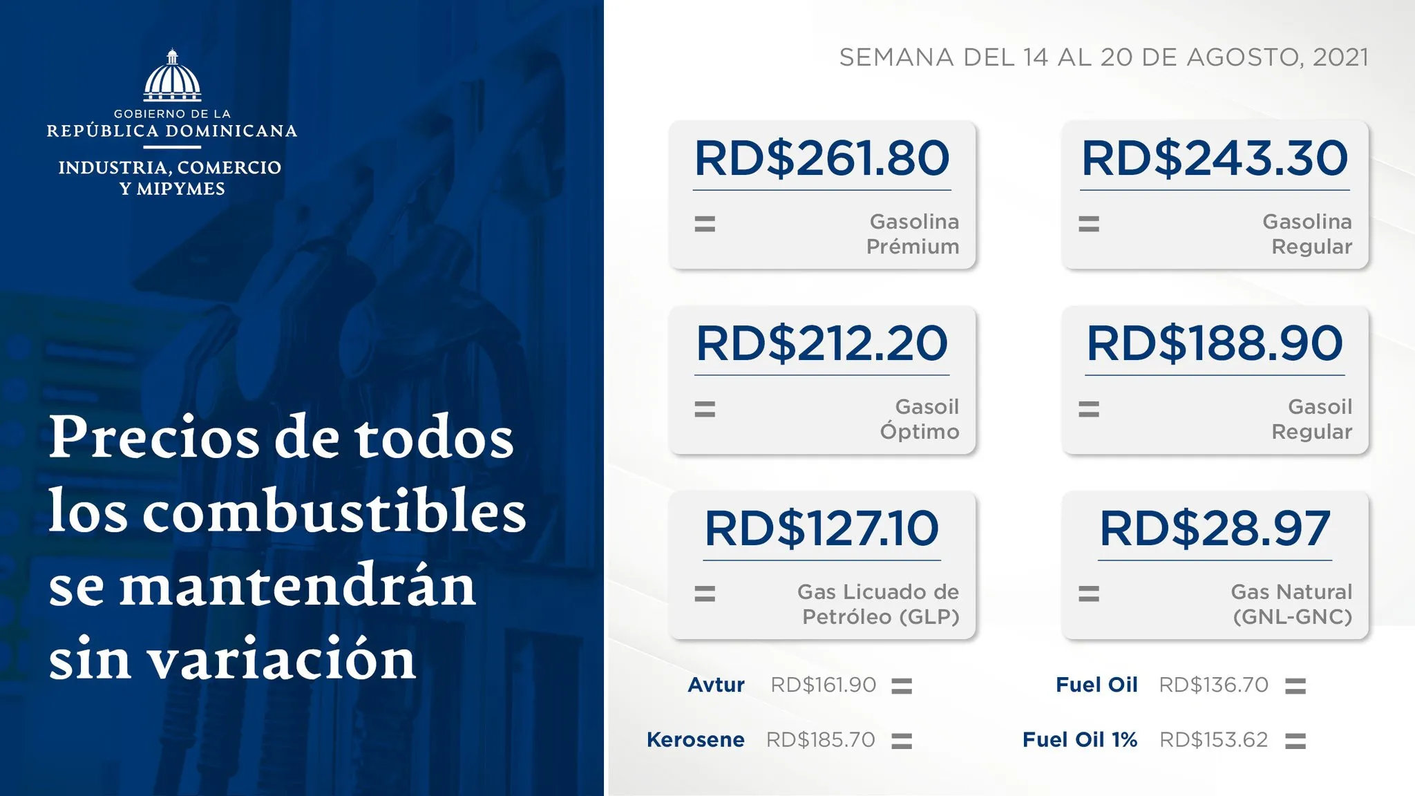 SANTO DOMINGO.- El Ministerio de Industria, Comercio y Mipymes (MICM) informó que los precios de los combustibles se mantendrán sin variación desde el 14 al 20 de agosto de 2021.