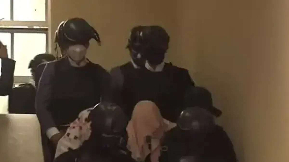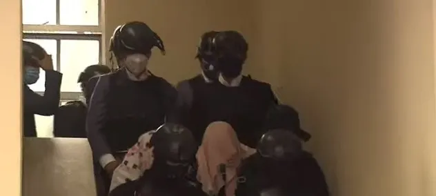 Algunos de los implicados se taparon el rostro mientras bajaban las escaleras para ser conducidos a la sala de audiencia.