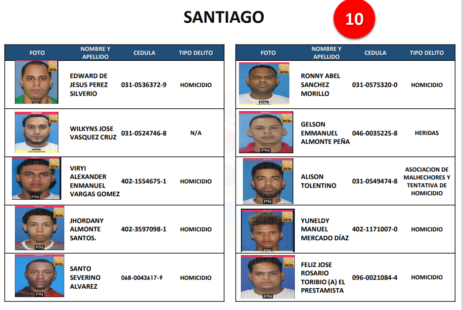 Santiago.– SANTIAGO.- La Policía Nacional ha revelado una lista de al menos 10 hombres considerados “peligrosos” y “fuertemente armados”, quienes están siendo buscados por diversos crímenes en Santiago.