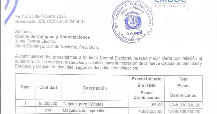 SANTO DOMINGO. – La empresa EMDOC, única en superar las pruebas técnicas para la licitación de la nueva cédula de identidad biométrica, presentó este martes su oferta económica por un valor de RD$3,363,322,412, durante la apertura oficial del sobre, realizada siete meses después de su depósito.