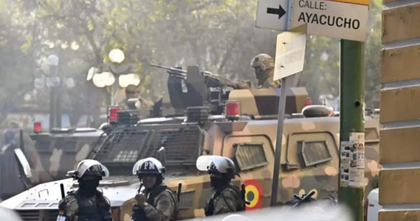 La Paz.– La Paz.- Un grupo de militares encabezados por el hasta hoy comandante general del Ejército de Bolivia Juan José Zuñiga, llegaron fuertemente armados a la plaza en la que está la sede del Gobierno de Bolivia y con un tanque tumbaron la puerta, acción que el presidente boliviano, Luis Arce, calificó como un "intento de golpe de Estado".