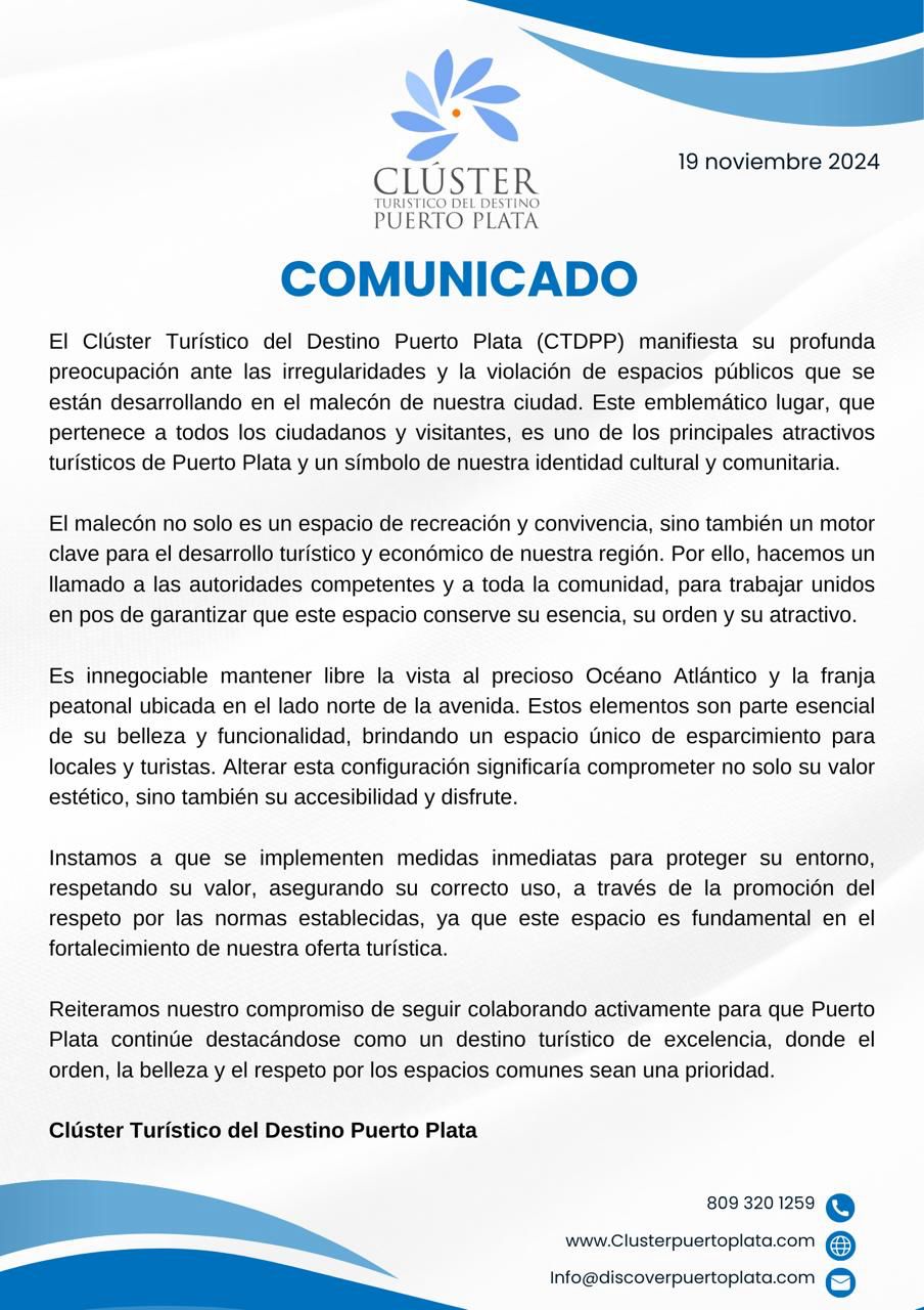 Puerto Plata. – El Clúster Turístico del Destino Puerto Plata, a través de un comunicado, mostró preocupación por el uso de espacios públicos en el Malecón de esa ciudad.