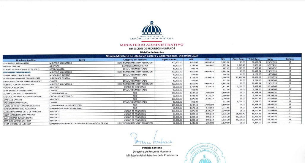 De acuerdo con una nómina publicada por el Ministerio Administrativo de la Presidencia (Mapre) en su página web, en el mes de diciembre de 2024, tanto el ex ministro Miguel Mejía, así como Fulcar y Cabrera Abud, devengaron un sueldo de 300 mil pesos.